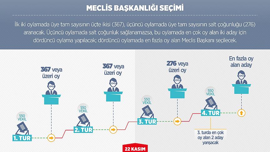 TBMM Başkanlığı seçimi için Genel Kurul, saat 15.00'te toplanacak. İlk iki oylamada üye tam sayısının üçte iki (367) ve üçüncü oylamada üye tam sayısının salt çoğunluğu (276) aranacak. Üçüncü oylamada salt çoğunluk sağlanamazsa, bu oylamada en çok oy alan iki aday için dördüncü oylama yapılacak; dördüncü oylamada en fazla oy alan Meclis Başkanı seçilecek.