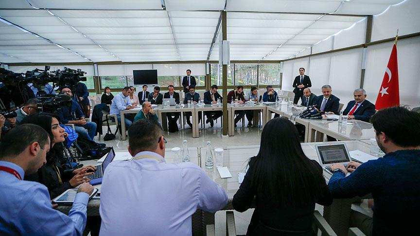 Yürüyerek Başbakanlık Resmi Konutu'ndan Basın Merkezi'ne gelen Yıldırım, gündeme ilişkin soruları yanıtladıktan sonra gazetecilerin haber yazdığı masalardan birisine oturdu. Binali Yıldırım, Başbakanlık muhabirleriyle bir süre sohbet etti.