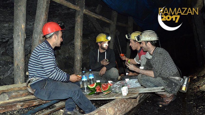 Asma Mahallesi'nde özel bir şirket tarafından işletilen maden ocağında 00.00-08.00 mesaisinde çalışan işçiler, sahur vaktinin yaklaşmasıyla baretlerinin ışığının aydınlattığı karanlık dehlizde ahşap direk ve kalaslardan sofralarını oluşturdu.