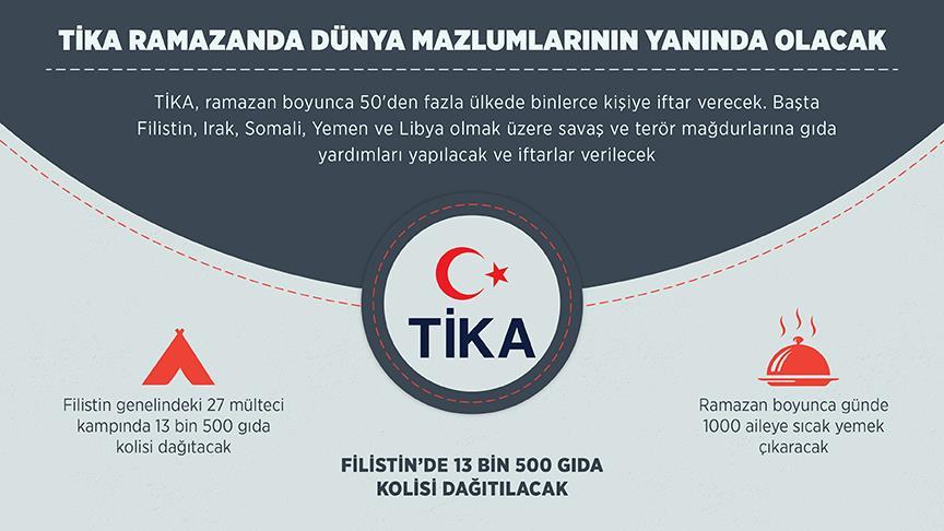 Balkanlar, Doğu Avrupa, Afrika, Asya, Latin Amerika ve Ortadoğu'daki 58 ülkede 60 ofisiyle faaliyet gösteren Türk İşbirliği ve Koordinasyon Ajansı Başkanlığı (TİKA), ramazan boyunca 50'den fazla ülkede 150 şehirde binlerce kişiye iftar verecek ve ihtiyaç sahiplerine gıda yardımında bulunacak.
