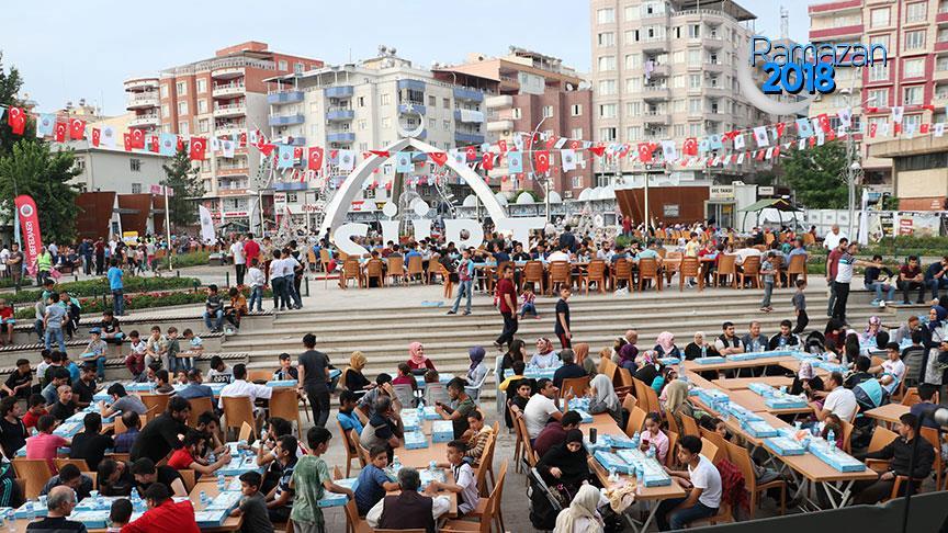 Siirt'te vatandaşlar, İçişleri Bakanlığınca görevlendirme yapılan Siirt Belediyesince "Siirt" yazısının oluşturulduğu sofrada orucunu açtı.