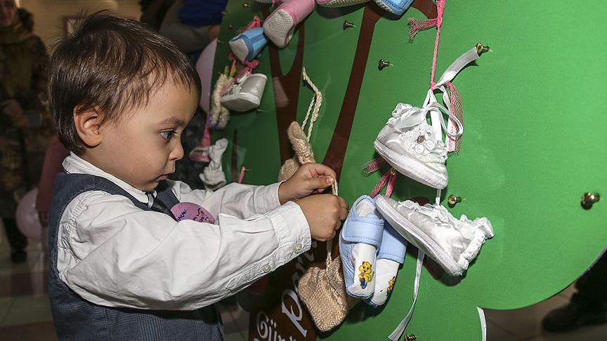 Hastanede doğan prematüre bebeklerin bir araya getirildiği etkinlikte katılımcılar, konuşmaların ardından birlikte ağaca patik astılar.