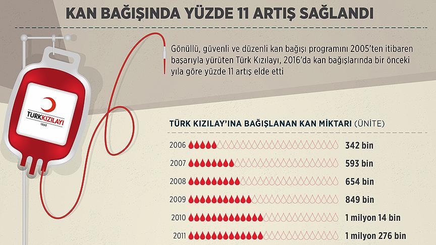 Kan bağışı sayısı 2014'te 1 milyon 860 bin 225, 2015 yılında ise 1 milyon 937 bin 932 üniteye çıktı. Geçen sene 2 milyon 141 bin 762 ünite kan bağışı alan Türk Kızılayı, bu yıl hedefini 2 milyon 271 bin olarak belirledi. 2016'da toplanan kan, önceki yıla göre ise yüzde 11 arttı.