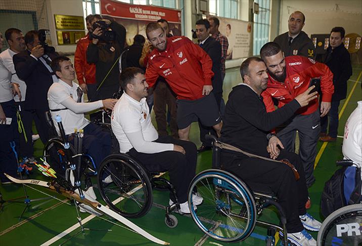 Tekerlekli sandalye basketbol takımı ve engelli okçuluk takımı sporcuları gazilerle bir araya gelip sohbet eden ve fotoğraf çektiren milliler, sporculara milli takım forması hediye etti.