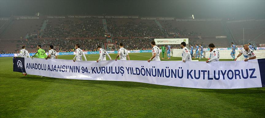 Kırmızı-siyahlı futbolcular, Hüseyin Avni Aker Stadı'nda Trabzonspor ile oynadıkları maçta sahaya, "Anadolu Ajansı'nın 94. kuruluş yıl dönümünü kutluyoruz" yazılı pankartla çıktı.