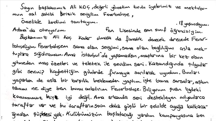 "Başkanımız Ali Koç kadar olmasa da fanatik derecesinde Fenerbahçeliyim. İstanbul'da yaşamadan, maçlarına bir kez olsun gitmeden, maç özetlerinden sevdim seni. Biliyorum ligdeki konumumuz şu an hiç iyi değil ama arkanda seni destekleyen milyonlarca taraftar var ve bu taraftarın senin daha güçlü şekilde ayağa kalkacağından şüphesi yok. Kulübümüzün başlatacağı yardım kampanyasına ben de Adana Okullar Arası Masa Tenisi müsabakalarında takımımı şampiyon yaptığımdan dolayı, okulumun bana verdiği para ödülünü hiçbir baskı altında kalmadan ve hiçbir karşılık beklemeden sana bağışlıyorum. Biliyorum belki bu para küçük gibi görünebilir lakin benim için hatta tüm öğrenci kardeşlerim için çok yüksek bir meblağ. İnşallah ayağa kalkacaksın ve 'Yeniden Fenerbahçe' başlığı altında nice başarılara imza atacaksın."