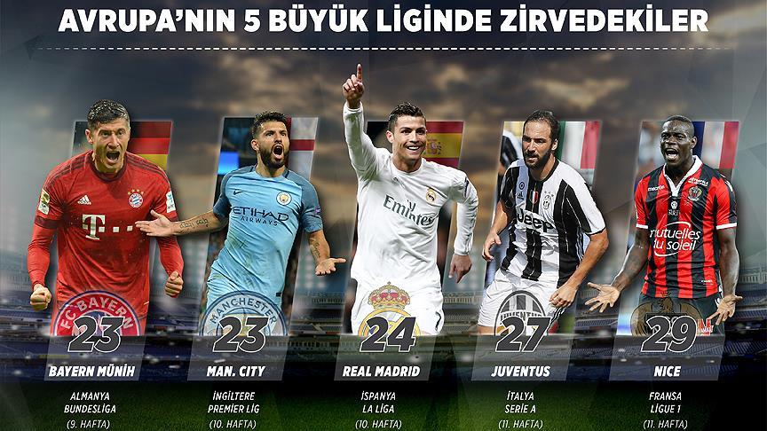 İngiltere'de Manchester City, İspanya'da Real Madrid, Almanya'da Bayern Münih, İtalya'da Juventus, Fransa'da ise Nice, haftayı lider kapadı.