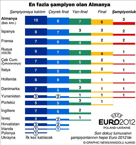 Futbol şampiyonasının 52 yıllık tarihinde 3 kez Batı Almanya olmak üzere 5 kez final oynamayı başaran Almanya, bunların üçünde kupayı kazanmayı başardı. Almanya 1972, 1980 ve 1996 yılında finalde rakiplerini geçerek, kupayı müzesine götüren taraf oldu.