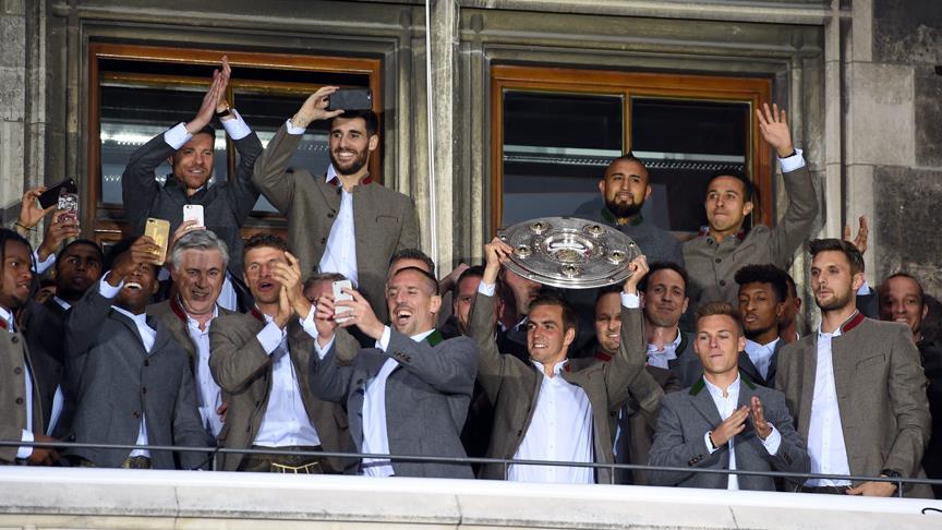 Statta başlayan şampiyonluk kutlamaları, şehrin merkezindeki Marienplatz Meydanı'nda devam etti. Kırmızı-beyazlı futbolcular, teknik kadro ve kulüp yöneticileri Bavyera eyaletinde giyilen geleneksel kıyafetlerle belediye binasının balkonuna çıktı.