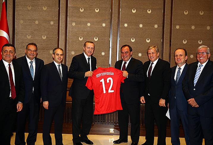 Cumhurbaşkanı Recep TayyipErdoğan, Gençlik ve Spor Bakanı Akif Çağatay Kılıç, Türkiye Futbol Federasyonu (TFF) Başkanı Yıldırım Demirören ve Türkiye Kulüpler Birliği Vakfı Başkanı Göksel Gümüşdağ ile beraberindeki heyeti kabul etti.