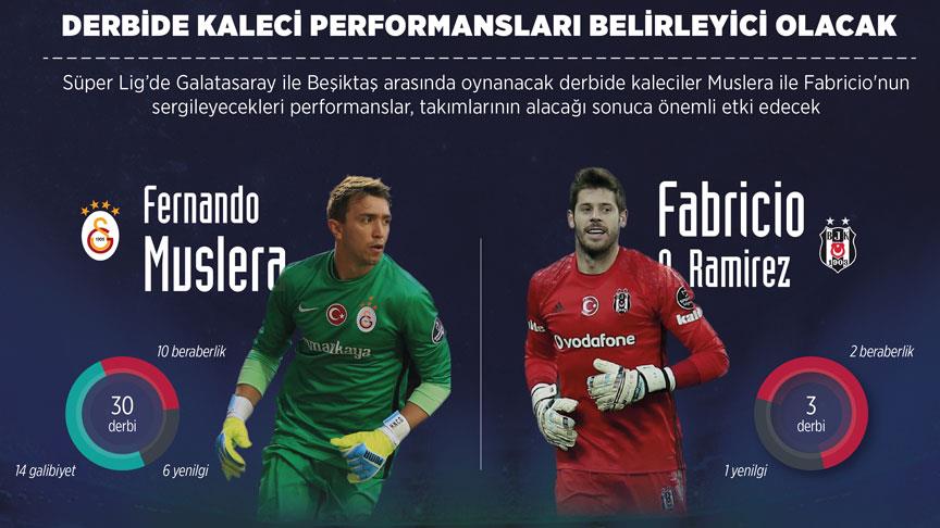Türk Telekom Arena'da yapılacak karşılaşmada kaleyi korumaları beklenen Galatasaray'ın 30 yaşındaki Uruguaylı kalecisi Fernando Muslera ile Beşiktaş'ın 29 yaşındaki İspanyol file bekçisi Fabricio Agosto Ramirez'in sergileyeceği performans, derbinin sonucuna doğrudan etki edecek.