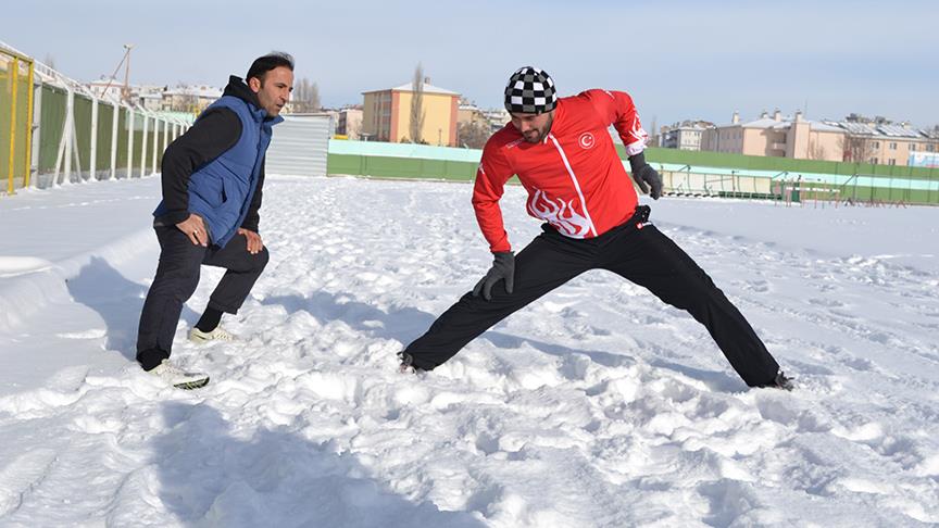 Hayata adeta atletizmle tutunan ve 8 yaşından beri bu sporu yapan Muhammet Amaç, hava sıcaklığının sıfırın altına düştüğü durumlarda bile çalışmalarını aksatmıyor.