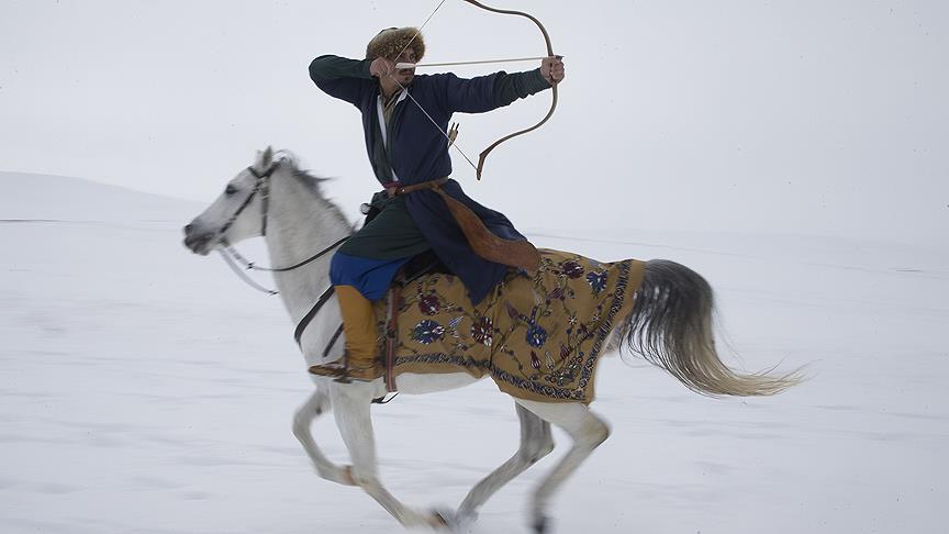 Dünya Atlı Okçuluk Şampiyonu Alperen Alkan, yeni başarılara imza atabilmek için olumsuz hava koşullarına rağmen karla kaplı alanda at üstünde ok atıyor.
