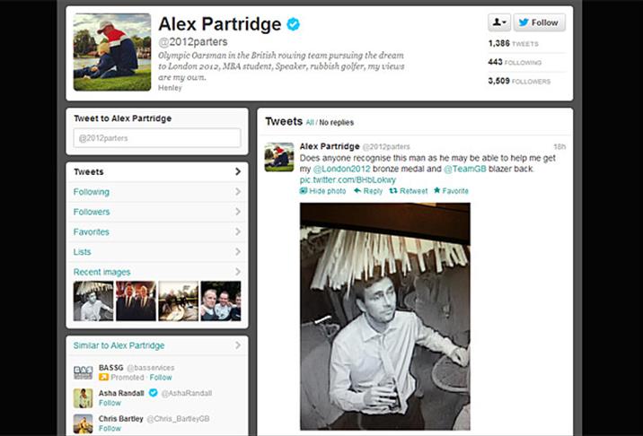 Londra Olimpiyatları'nda bronz madalya kazanan Büyük Britanya'dan okçu Alex Partridge ve çim hokeyi oyuncusu Hannah Macleod, Londra'nın Mayfair bölgesindeki bir gece kulübünde kaybettikleri madalyalarının peşine Twitter'da düştü. Partridge, 2012parters; Macleod, ise hannahmacleod06 isimli Twitter hesabından, bilgi verebileceğini umdukları bir adamın, güvenlik kamerası tarafından kaydedilen resmini yayımladı.
