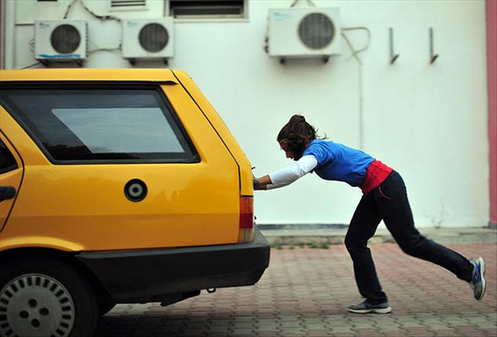 Bosna Hersek'te 25-30 Ağustos tarihlerinde düzenlenecek Yıldız Kızlar Dünya Şampiyonası'na hazırlanan 17 yaşındaki Hatice Ece Tekin, milli takım kampı öncesi uyguladığı programda, otomobil iterek kuvvetini arttırmaya çalıştı.