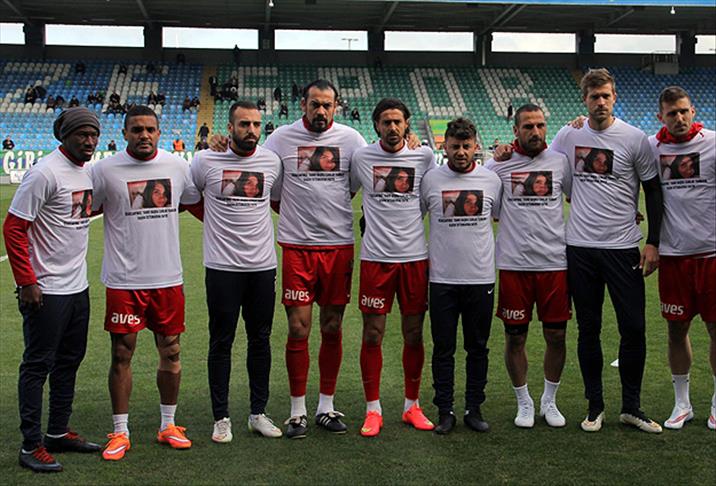 Spor Toto Süper Lig takımlarından Mersin İdmanyurdu oyuncuları, Çaykur Rizespor ile Rize Yeni Şehir Stadı'nda oynayacağı maç öncesinde sahaya Özgecan Aslan'ın fotoğraflarının yer aldığı tişörtlerle çıktı.