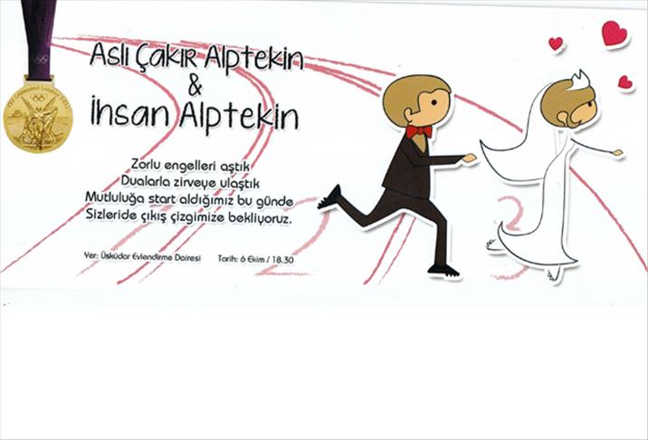 Aslı-İhsan Alptekin çiftinin davetiyelerinin üzerinde, ''Zorlu engelleri aştık. Dualarla zirveye ulaştık. Mutluluğa start aldığımız bu günde sizleri de çıkış çizgimize bekliyoruz'' ifadeleri yer aldı.