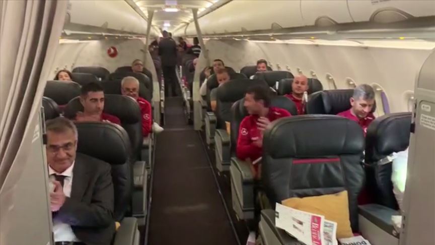 Uçak içinde kaydedilen görüntülerde, milli takım teknik heyetinin ve futbolcuların bu anonsa alkışlarla karşılık verdiği görülüyor.