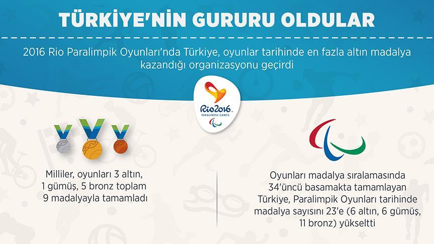 Türkiye Milli Takımı, 2016 Rio Paralimpik Oyunları'nda kazandığı 5 bronz madalyayı, judo, atletizm, atıcılık ve masa tenisi branşlarından elde etti.