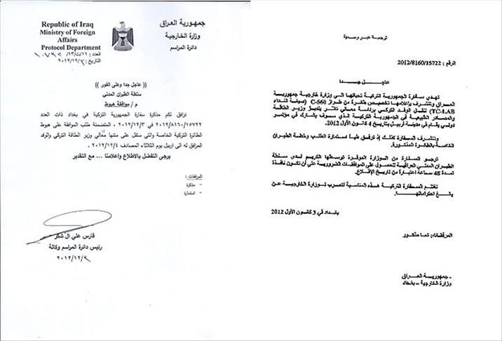 Anadolu Ajansı'nın (AA) ulaştığı belgeye göre Türk Büyükelçiliği, Irak Dışişleri Bakanlığı'na 3 Aralık tarihinde ''çok acil'' koduyla gönderdiği yazıyla Enerji Bakanı Taner Yıldız'ın başkanlığındaki Türk heyetinin 4 Aralık'ta C-560 tipi özel uçakla Erbil'e yapacağı ziyaret için gerekli iznin alınmasını talep etti. Yazıda, uçağın havalanmasından itibaren 48 saat süreyle uçuş ve Erbil'e iniş izni istendi. Başvuruya uçuş rotası ve gerekli formun eklendiği belirtildi.