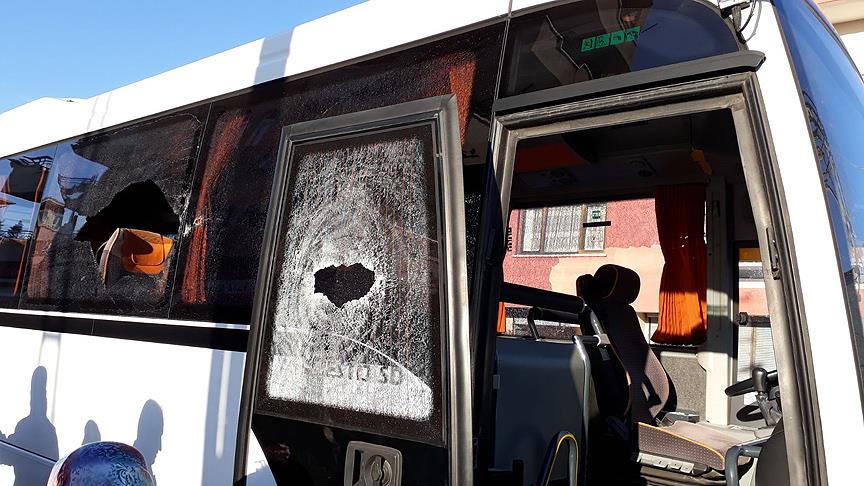 Saldırı nedeniyle servis midibüsünün bazı camları kırıldı.