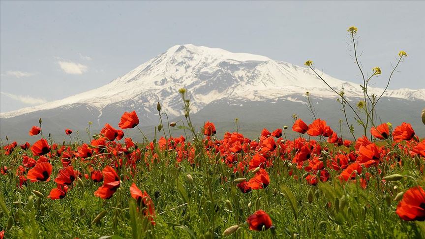 "Türkiye'nin çatısı" olarak nitelendirilen, Ağrı Dağı'nın Iğdır'ın Aralık ilçesi kesiminde, baharın etkisini göstermesiyle gelincikler açtı.