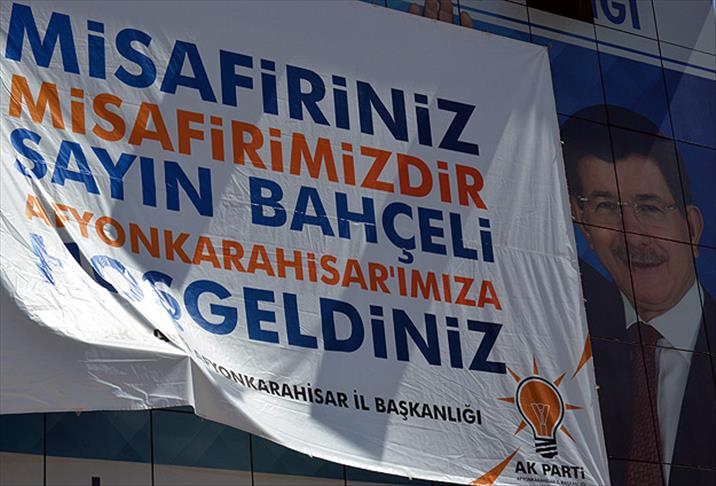 AK Parti Afyonkarahisar İl Başkanlığı binasına, MHP'nin bugün yapılan mitingi öncesi "Misafiriniz, Misafirimizdir. Sayın Bahçeli Afyonkarahisarımıza Hoşgeldiniz" yazılı 40 metrekare büyüklüğünde pankart asıldı.