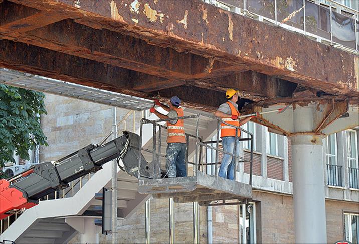 Ekiplerin yaklaşık 3,5 saat süren çalışmasının ardından üst geçidin kaplamaları ve kaldırım taşları söküldü.