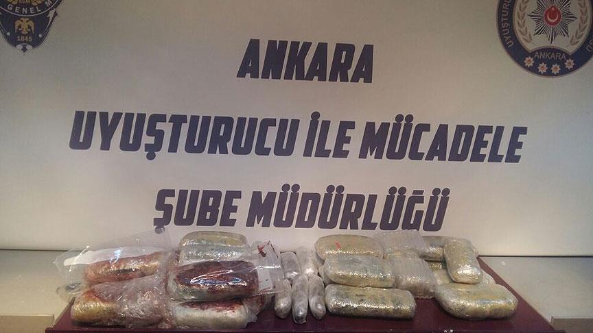 AA muhabirinin aldığı bilgiye göre, Ankara Emniyet Müdürlüğü Uyuşturucuyla Mücadele Şubesi ekiplerince, 27 Mart-3 Nisan arasında gerçekleştirilen operasyonlarda, 55 kilo 40 gram esrar, 872 gram eroin, 10 gram kokain, 12 gram "skunk" (genetiği değiştirilmiş esrar maddesi), 9 gram "bonzai", 9 gram metamfetamin olmak üzere toplam 55 kilo 952 gram uyuşturucu madde ve 58 adet uyuşturucu hap ele geçirildi.