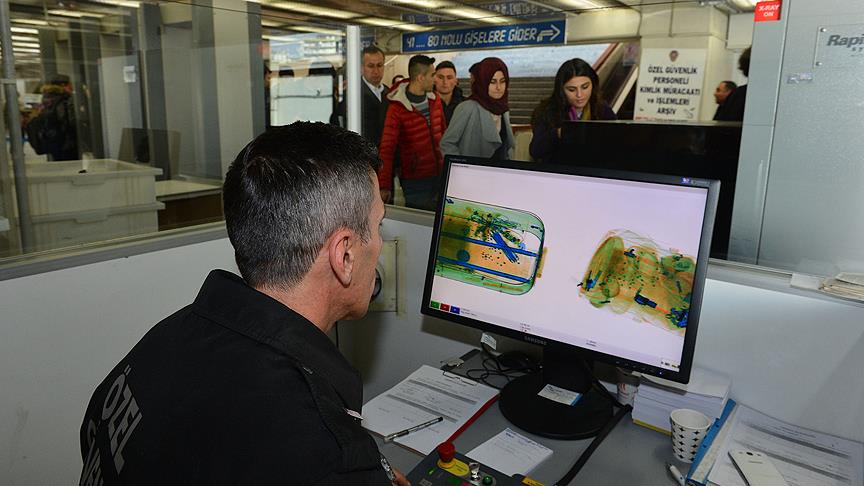 Kapı sayıları azaltılarak, kontrollerin daha etkin hale getirildiği AŞTİ'ye Ankaray ile gelen yolcuların valizleri x-ray cihazından geçirilirken, yolcular da dedektörle üst aramasına tabi tutuluyor.