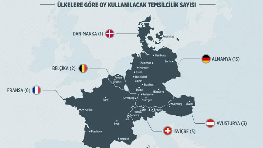 Avusturya’da Viyana, Salzburg ve Bregenz olmak üzere üç bölgede, Belçika’da Brüksel ve Anvers'de, Fransa’da Paris, Lyon, Marsilya, Nantes, Strazburg ve Bordeaux bölgelerinde, İsviçre’de Zürih, Cenevre ve Bern şehirlerinde ve Danimarka’da Kopenhag Büyükelçiliğindeki sandıklarda oy verilebilecek.