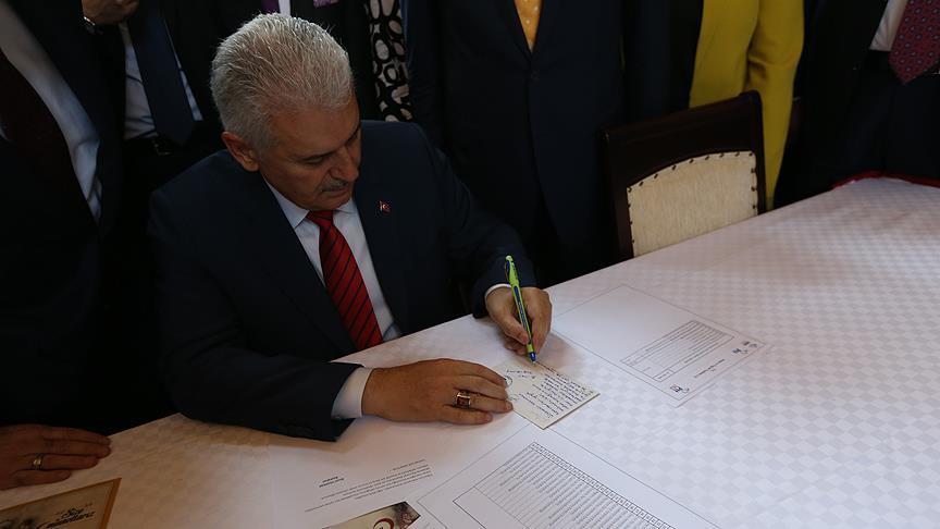 Başbakan Binali Yıldırım, PTT tarafından TBMM'de "Size minnettarız" sloganıyla kurulan stantta, "Tebrik Kartı Bizden, Güvenlik Güçlerimize Göndermek Sizden" kampanyasına katıldı.