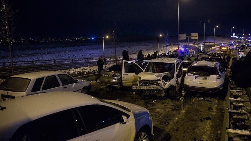 Yenimahalle ilçesinden Ulus istikametine giderken Batı Bulvarı üzerinde aralarında otomobil, kamyonet ve minibüslerin de bulunduğu 25 araç, gizli buzlanma nedeniyle çarpıştı.