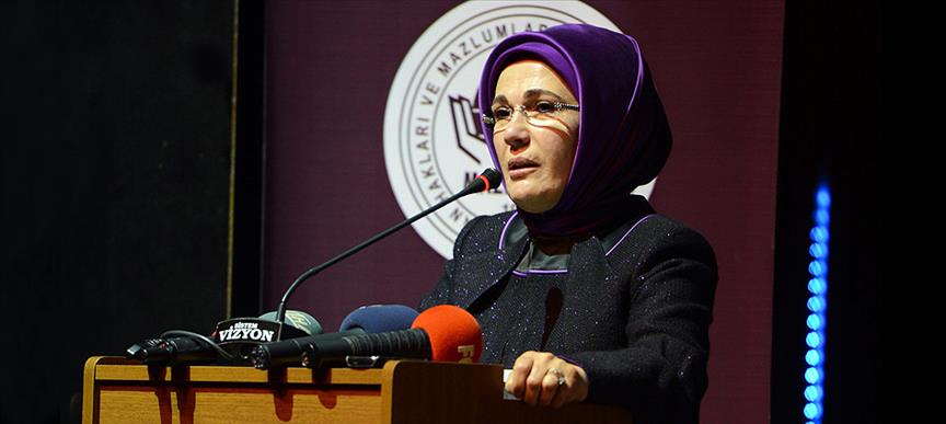 Emine Erdoğan, konuşmasında, ''Bugün Türkiye, canını, onurunu, namusunu kurtarmak için Suriye'den gelenlere kollarını açıyor, imkanlarını seferber ediyor. Buna karşılık Batılı ülkeler ve uluslararası kuruluşlar, maalesef yasak savma kabilinden, cılız tepkilerin ötesinde, etkin bir tavır içine girmiyorlar. Bu çifte standardı kabul etmek, anlayışla karşılamak asla mümkün değil'' ifadelerini kullandı.