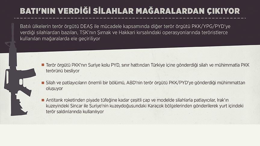 Batılı ülkelerin terör örgütü DEAŞ ile mücadele kapsamında diğer terör örgütü PKK/YPG/PYD'ye verdiği silahlardan bazıları, Türk Silahlı Kuvvetlerinin (TSK) Şırnak ve Hakkari kırsalındaki operasyonlarında teröristlerce kullanılan mağaralarda ele geçiriliyor.