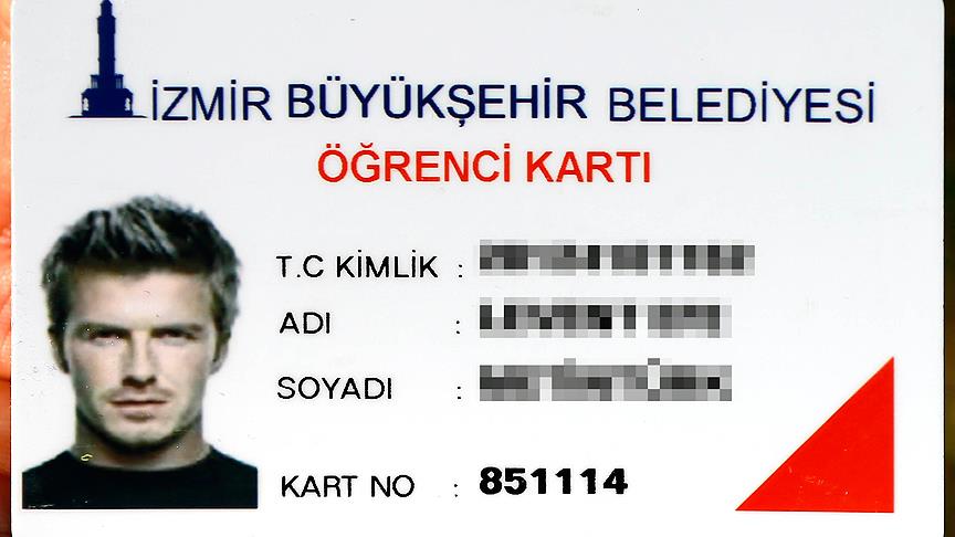 İzmir'de bir üniversite öğrencisi, Büyükşehir Belediyesinin internet sitesi üzerinden başvurduğu indirimli ulaşım kartını, sistemin kendi fotoğrafını kabul etmemesi üzerine deneme amacıyla yüklediği ünlü futbolcu David Beckham'ın fotoğrafıyla aldı.