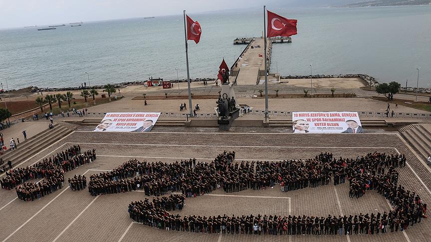 Hatay'ın İskenderun ilçesinde bir araya gelen bin 919 kişi, bedenleriyle "Atatürk imzası" şekli oluşturdu.