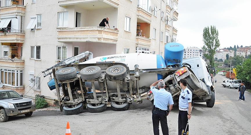 Alınan bilgiye göre, Taşliman Mahallesi Aktoprak Caddesindeki inşaata beton taşıyan 34 KP 3863 plakalı beton mikseri, yokuştan inerken sürücüsü Levent Çoban'ın (46) direksiyon hakimiyetini kaybetmesi sonucu bir evin balkonuna devrildi. Olayı gören vatandaşlar, polis ve 112 Acil Servis ekiplerine haber verdi.