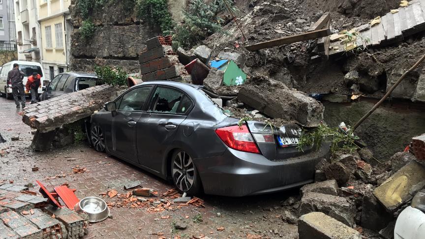 Beyoğlu'nda istinat duvarının çökmesi sonucu 3 araç zarar gördü.