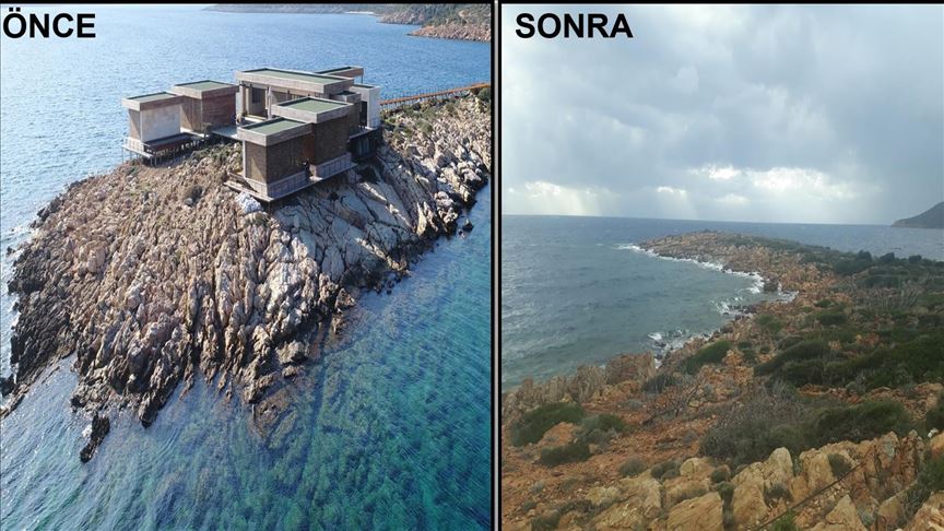 Muğla'nın Bodrum ilçesinde, geçen yıl başlatılan kaçak yapıların yıkım öncesi ve sonrası çekilen fotoğrafları, çalışmaların boyutlarını ortaya koydu.
