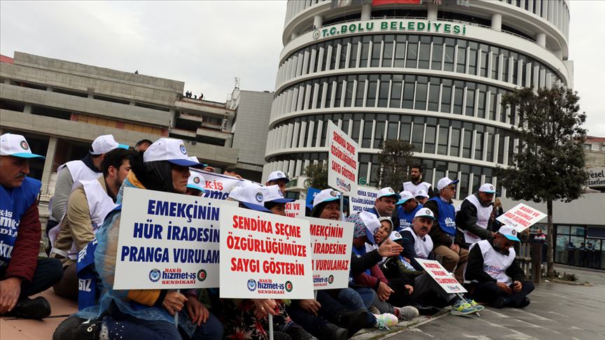 CHP'den Bolu Belediye Başkanı seçilen Tanju Özcan'ın göreve gelmesinin ardından işten çıkarılan 97 taşeron işçi, Hizmet-İş Sendikası temsilcileri ile Demokrasi Meydanı'nda bulunan belediye binasının önünde bir araya geldi.