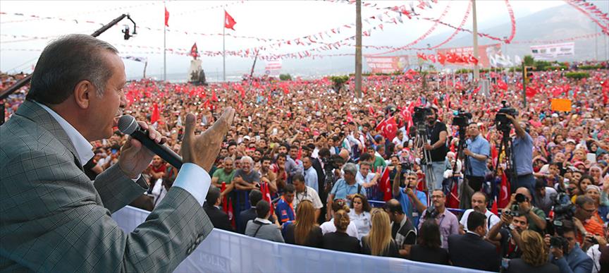 Erdoğan, "Biliyorsunuz bunu bile hazmedemediler, o malum terör örgütünün arkasında olduğu yapı ne diyor? 'Her çağrıldığı yere gidiyor.' Elbette gideceğim. Ben milletimin içinden geldim. Her fırsatta milletime gidiyorum. Siz dağa gidiyorsunuz, ben milletime gidiyorum. Farkımız bu. Onlar talimatı Kandil'den alıyor. Ben ise talimatı milletimden alıyorum. Farkımız bu" diye konuştu.