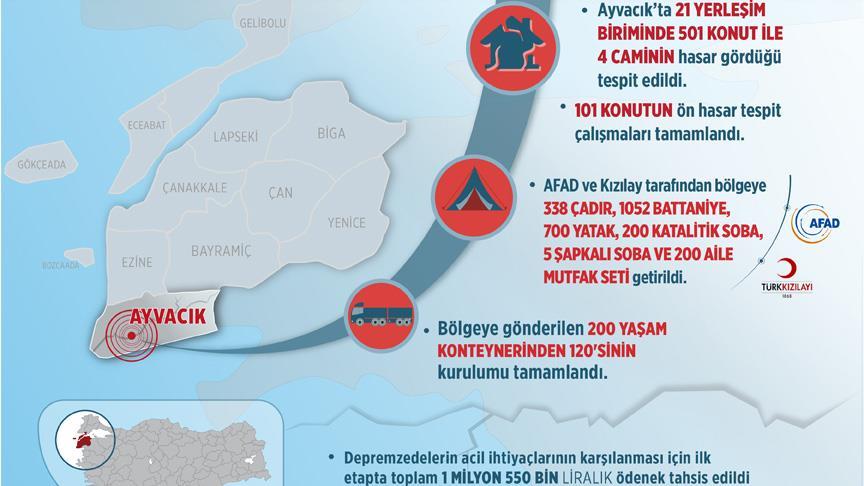 Çanakkale'nin Ayvacık ilçesinde meydana gelen 5,3'lük iki depremin ardından zarar gören 21 yerleşim biriminde yaralar sarılıyor.