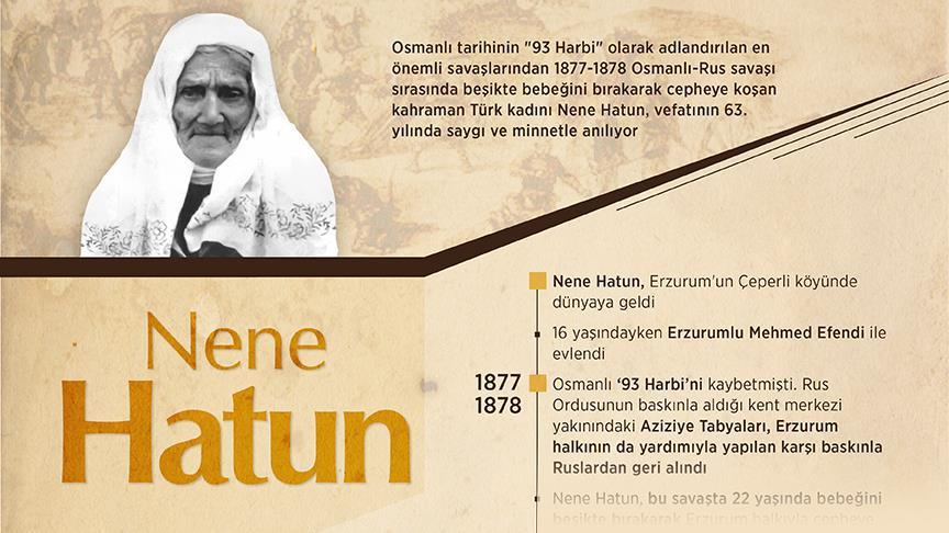 Osmanlı tarihinin "93 Harbi" olarak adlandırılan en önemli savaşlarından 1877-1878 Osmanlı-Rus savaşı sırasında beşikte bebeğini bırakarak cepheye koşan kahraman Türk kadını Nene Hatun, vefatının 63. yılında saygı ve minnetle anılıyor.