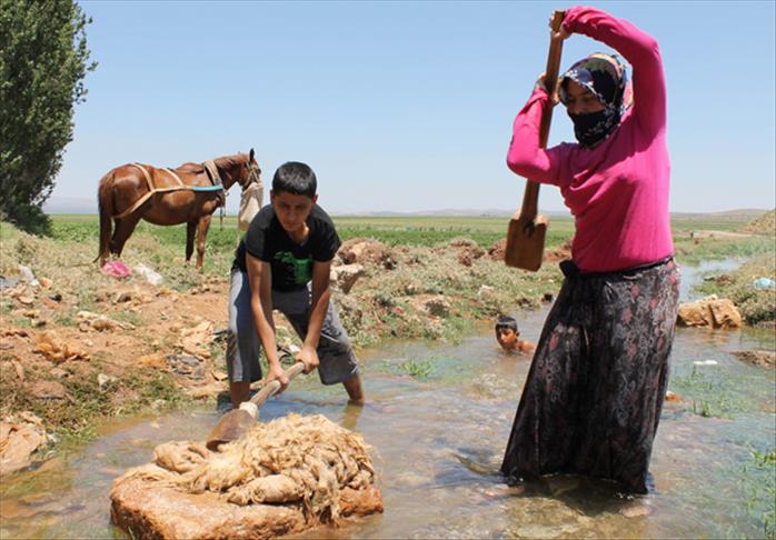 Yünlerini derede önce yıkayan, ardından tokmakla döverek temizlenmesini sağlayan vatandaşlar, daha sonra yünleri sabunlayarak temizliyor.