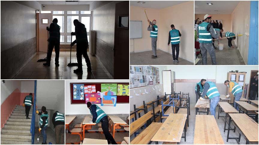 Denetimli serbestlik müdürlükleri tarafından takip edilen ve kamu kurumlarında ücretsiz çalışma cezası bulunan yükümlüler, yarıyıl tatilinde okul binalarını ikinci döneme hazırlıyor.
