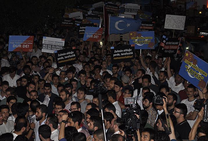 AGD Kahramanmaraş Şubesi öncülüğünde teravih namazı sonrası Ulu Cami önünde toplanan grup "Zalimler için yaşasın cehennem" ve "Müslüman uyuma, Doğu Türkistanlı kardeşlerini duanda unutma" yazılı dövizlerle Çin aleyhine sloganlar attı.