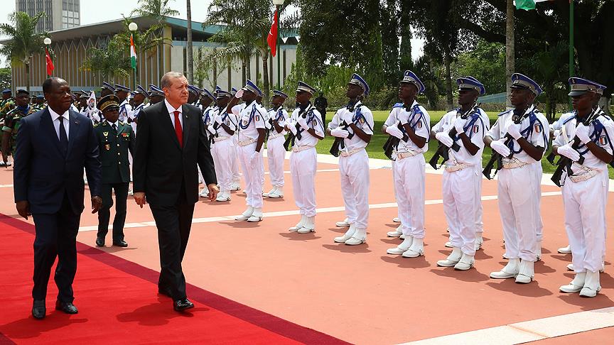 Resmi ziyaret için Fildişi Sahili'nde bulunan Cumhurbaşkanı Erdoğan'ı, Başkanlık Sarayı'na gelişinde tören birliği karşıladı.