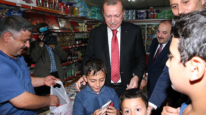 Erdoğan, ilçe merkezinde makam aracını durdurarak vatandaşlarla bir süre sohbet ederek hatıra fotoğrafı çektirdi, çocuklara oyuncak dağıttı. Daha sonra bir markete giren Erdoğan, aldığı çikolataları çocuklara dağıttı.