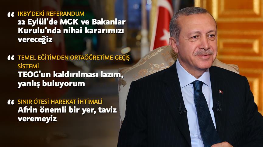 TEOG'a yönelik süreç konusunda da Erdoğan, "Kaldırılacak hemen, kaldırdık, bitti. Bunun kararını verecek olan hükümettir. Bu ülkenin Cumhurbaşkanı olarak bunu Bakanıma, Başbakanıma bir kere söylerim olur biter. Ama ben Sayın Bakan'a söyledim, yarın zaten Sayın Başbakanımızla da burada görüşmem var, kendisiyle bunu paylaşacağım. Bak böyle böyle. Hafta başı bu böyle başlamış veya önümüzdeki hafta devam edecek, bu konuda artık kararı kesinlikle süratle alalım Başbakanım, bunlardan kurtaralım bu ülkeyi. Biz artık böyle ilkel bir durumda değiliz, o geçmişte kaldı, neler çekti bu ülke yetti artık." dedi.